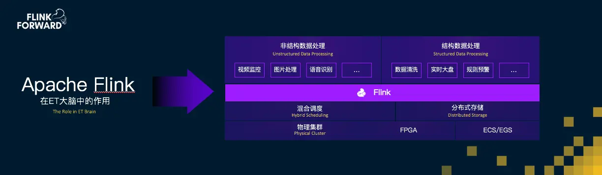 在这个架构图中大家可以看到 ET 大脑底层有各式混合调度等基础技术系统,中间层是用Flink的方式对结构化、非结构化甚至半结构化的数据,做混合的双流、多种流的实时Join。