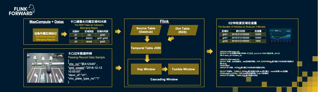 这张图从左往右看,从最外场的卡口摄像头以及传感器用于采集过车速度、车牌类型等数据,这些数据实时进入Flink计算引擎之后在RDS当中Dim Table 进行汇总,汇总后我们可以得到一个移动的时间窗口(Hop Window)。这个时间窗口的长度大概是15分钟,每隔两分钟我们就把它往未来移动一次,因此,你会发现这个时间窗口每两分钟就会产生一次过去15分钟内所统计到的数据。
