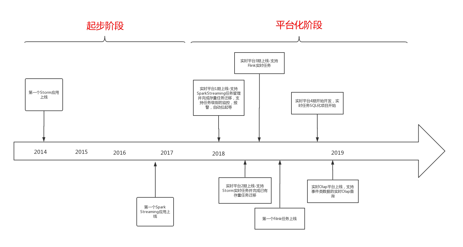 从技术栈的角度,我们的选择和大多数互联网公司一致,从早期的 Storm,到 JStorm, Spark Streaming 和最近兴起的 Flink。从发展阶段来说,主要经历了两个阶段,起步阶段和平台化阶段;下面将按照下图中的时间线,介绍实时计算在有赞的发展历程。