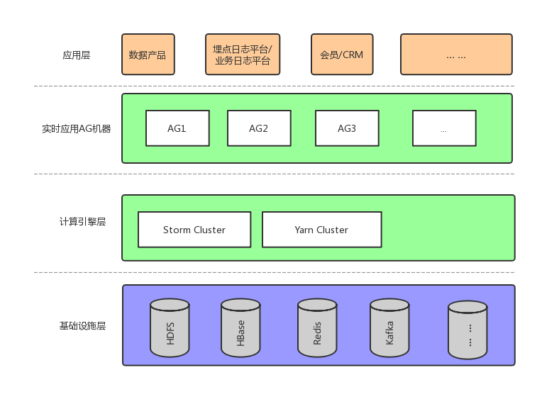 早期,用户通过登录一组线上环境的 AG 服务器,通过 Storm 的客户端向 Storm 集群做提交任务等操作, 这样两年多的时间里,Storm 组件积累了近百个实时应用。 Storm 也同样暴露出很多问题,主要体现在系统吞吐上:对吞吐量巨大但是对延迟不敏感的场景,显得力不从心。