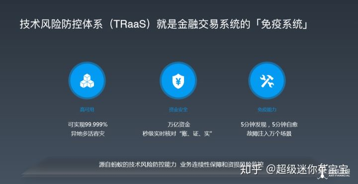 在这方面,蚂蚁内部做了一套技术风险体系叫 TRaaS,它在高可用和资金安全风险方法能力的基础上,可以做到五分钟发现、五分钟恢复,这个是基础。另外一点则是主动的发现故障的能力,因为有时候出了问题才知道这个地方是问题了,不出问题觉得这个架构是非常完美的。所以,蚂蚁通过红蓝对抗,每天都在不断主动发现故障,这个就是技术风险的防范体系,也叫蚂蚁的免疫系统。