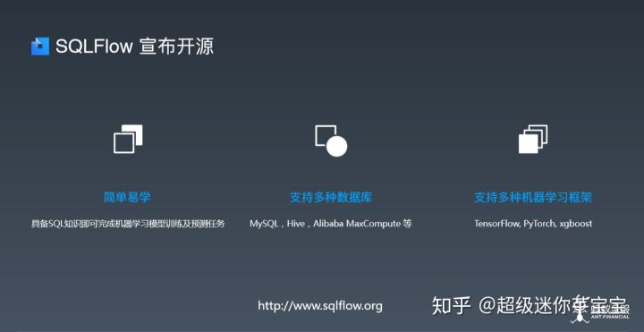 - 蚂蚁金服最新开源的 SQLFlow,抽象出端到端从数据到模型的研发过程,配合底层的引擎及自动优化,我们希望让人工智能应用像 SQL 一样简单。