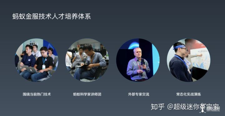 所以我觉得人才是非常非常关键的,只有找到这些人才,才能把这些事情好,才能做一些大的变化,才能对未来的不确定性做一些准备。在蚂蚁金服内部有着一个叫“BASIC College”的技术培养体系,BASIC 一方面对应着 Blockchain (区块链)、Artificial Intelligence(人工智能)、Security(安全)、 IoT(物联网)和 Cloud Computing(云计算)五大领域,另一方面代表我们始终专注于金融科技的本质——计算机基础技术能力的提升。因此,蚂蚁金服的“BASIC College”主要围绕热门或前沿的领域,做有针对性的培训,比如 AI 课程等;同时,课程还会涉及到蚂蚁历史上的重要技术方向决策。另外,我们除了有内部的讲师团,还邀请外部的专家、学者进行技术的分享与交流。我们认为,只有整个技术氛围是开放的才可能真正把技术这件事做到极致。