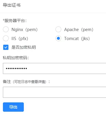 第一步,导出证书。假如服务器选择的 Tomcat,需要导出 Java keystone (简拼为 jks)格式的证书。