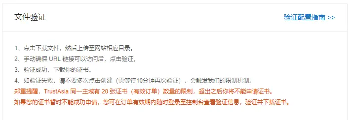 文件验证(HTTP):CA 将通过访问特定 URL 地址来验证我们是否拥有域名的所有权。因此,我们需要下载给定的验证文件,并上传到您的服务器。