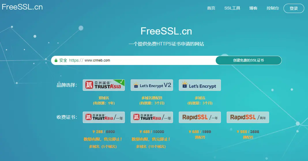 第一步,填写域名,点击「创建免费的 SSL 证书」