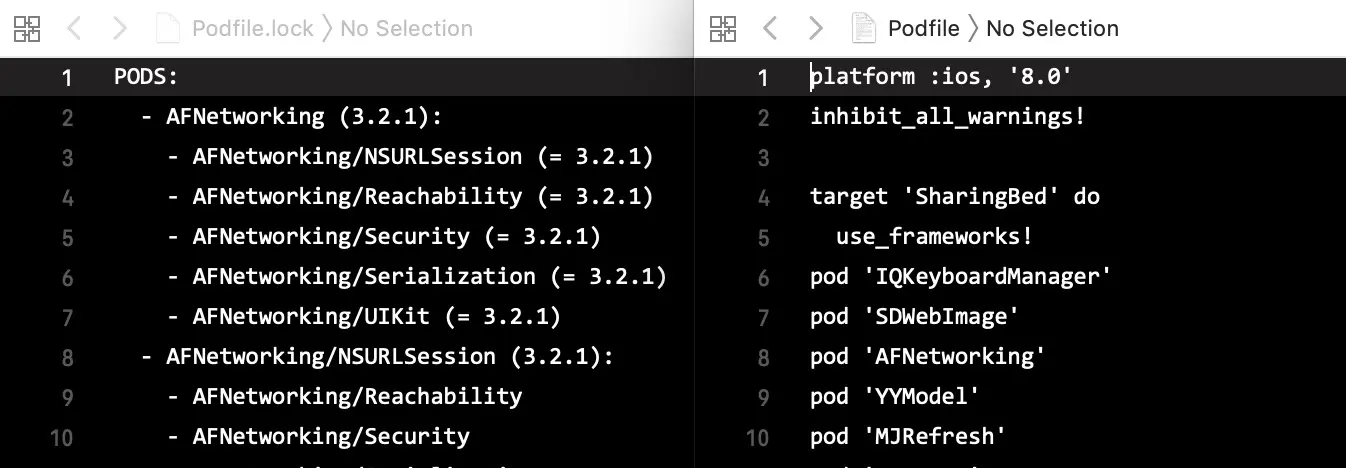 而 Podfile 和 Podfile.lock 两者的区别是,一个文件中有框架的版本信息, 一个没有