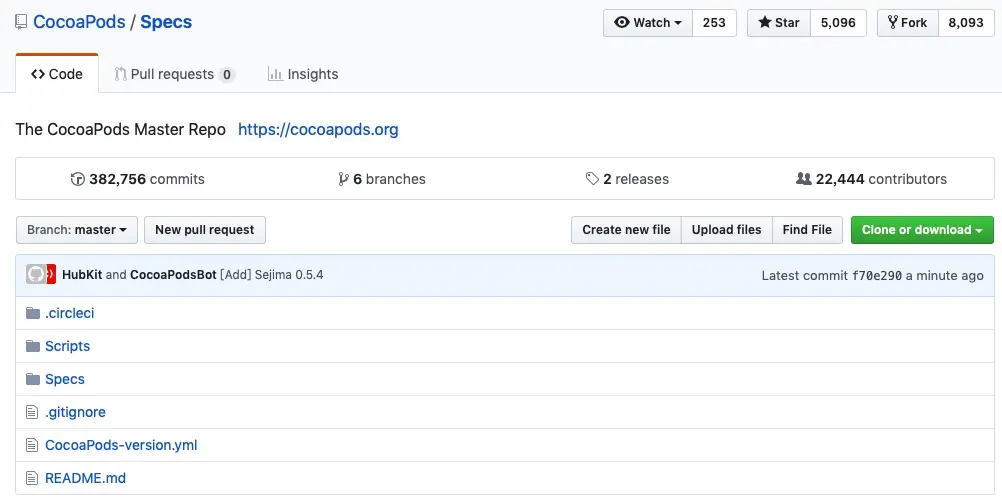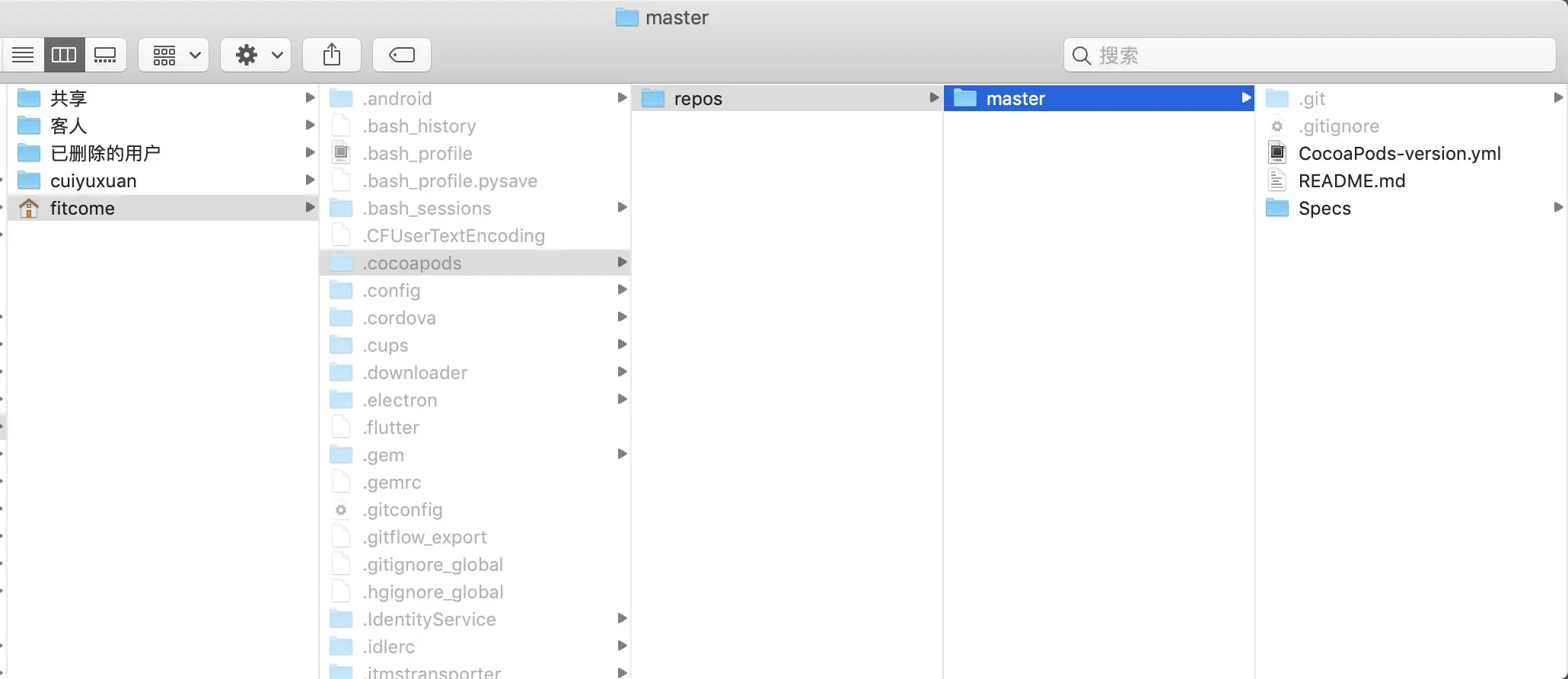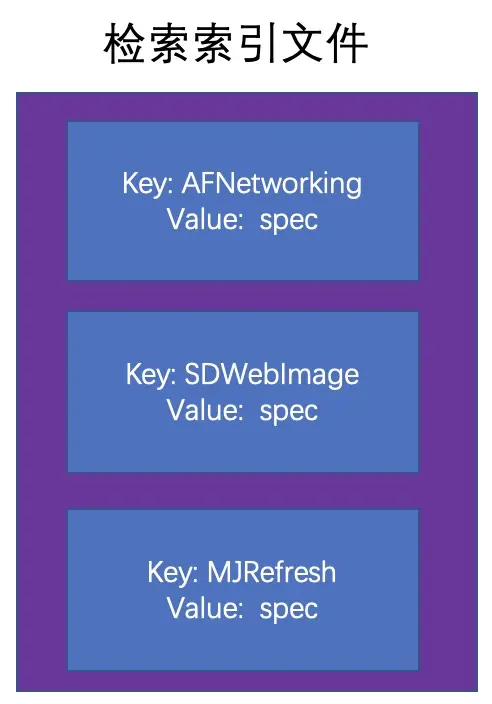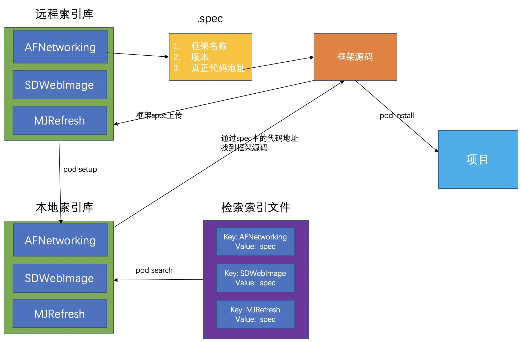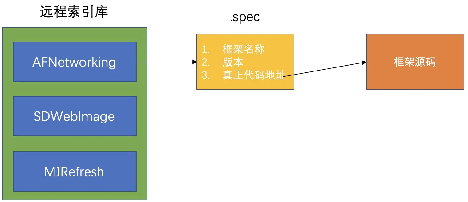 在Cocoapods中其实存在着这么一个远程索引库, 这个库中存储的不是框架的代码,而是框架的描述信息,其实就是.spec