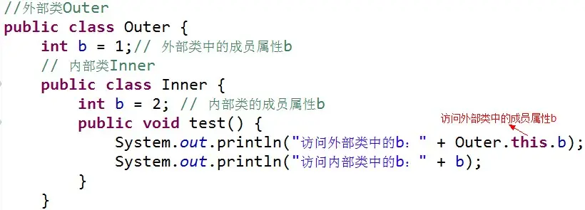 - 如果外部类和内部类具有相同的成员变量或方法,内部类默认访问自己的成员变量或方法,如果要访问外部类的成员变量,可以使用 this 关键字。