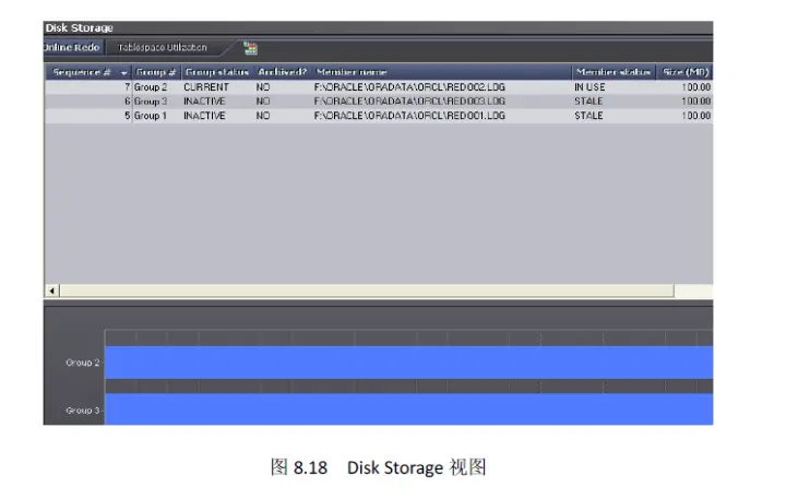 Disk Storage 视图主要显示磁盘存储情况,包括Oracle 表空间利用率和在线日志的存储空间使用情况,如图8.18 所示。