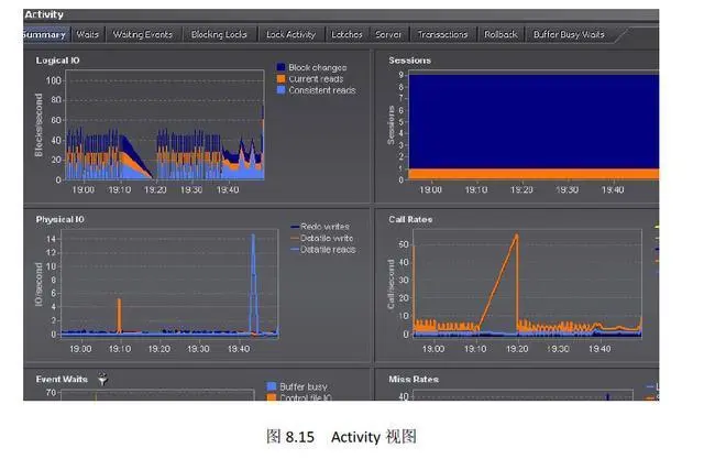 Activity 视图主要提供了等待事件,锁等待,闫锁等待,当前事务等,如图8.15 所示。