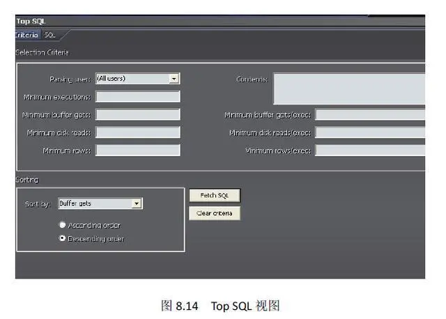 在 Top SQL 视图中,可根据条件来筛选查看LibraryCache 中相应的SQL 语句,如图8.14所示,可以协助我们找出对性能影响比较大的SQL 语句。
