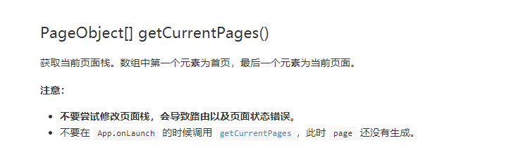 主要是用了小程序提供的getCurrentPages方法,具体内容可查看文档,我这里直接就贴图了,因为文档说的很简单