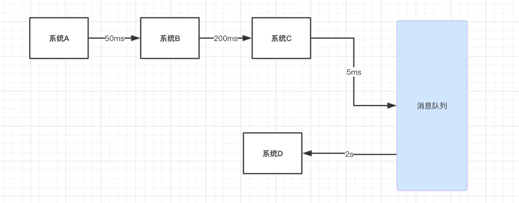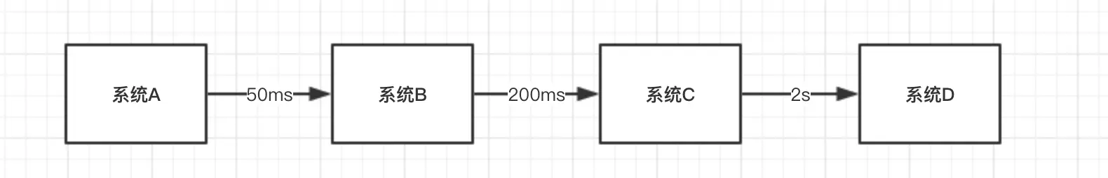 假设你有一个系统调用的链路,系统A 调用系统B 耗时 50ms,系统B 调用系统C 又需要200ms ,系统C 调用系统 D ,需要做比较超时的操作,需要 2s,如下图所示: