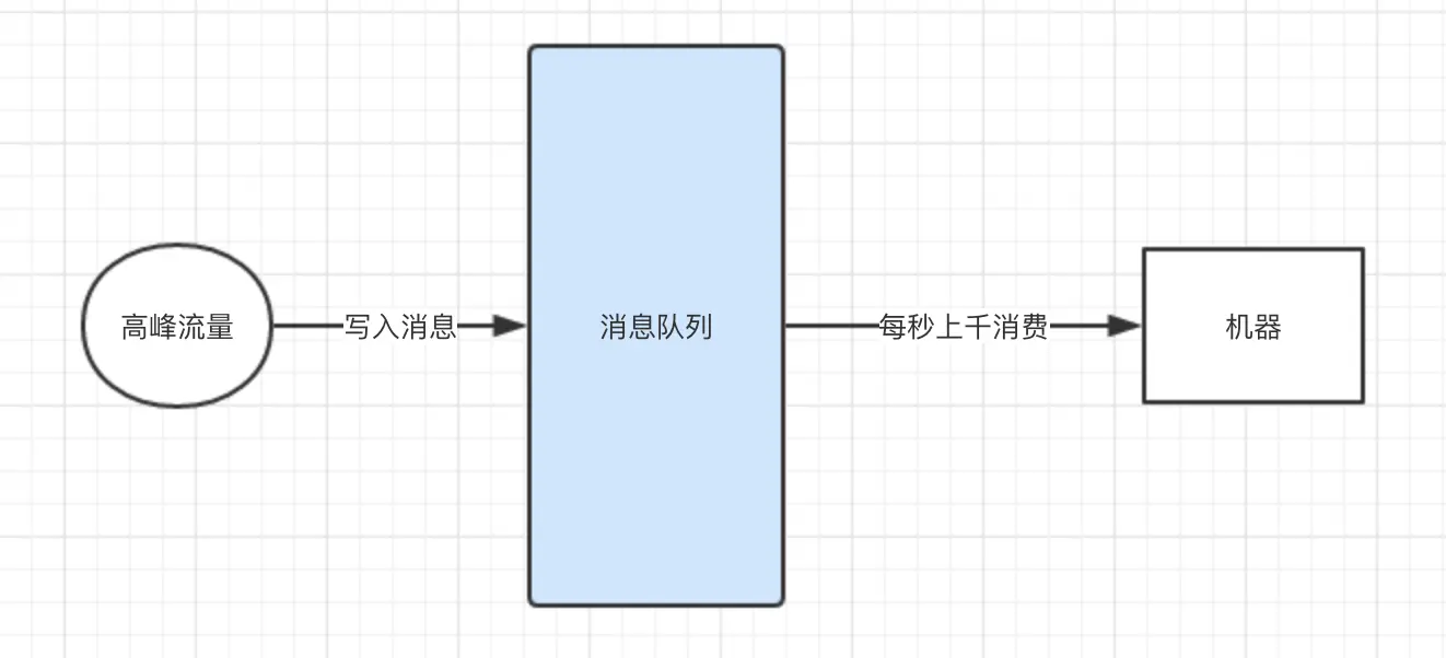 一旦到了瞬时高峰期,一下涌入每秒几千的请求,就可以积压在MQ里面,然后那一台机器慢慢的处理和消费。