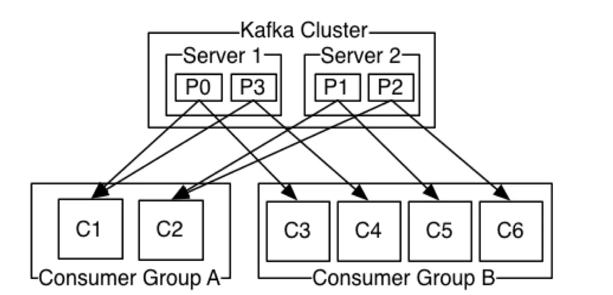 说明:由2个broker组成的kafka集群,总共有4个Parition(P0-P3)。这个集群由2个Consumer Group, A有2个 consumer instances ,而B有四个.