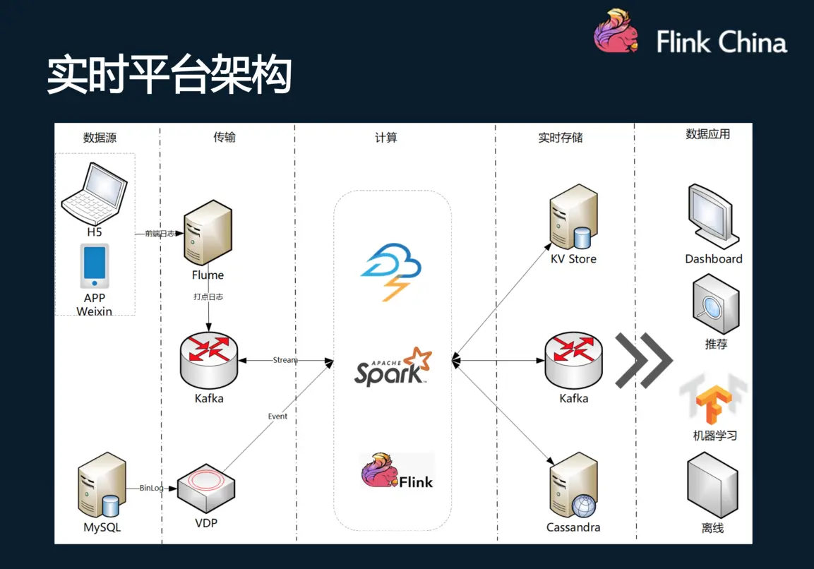 在架构设计上,包括两大数据源。一种是在App、微信、H5等应用上的埋点数据,原始数据收集后发送到在kafka中;另一种是线上实时数据的 MySQL Binlog 日志。数据在计算框架里面做清洗关联,把原始的数据通过实时ETL为下游的业务应用(包括离线宽表等)提供更易于使用的数据。