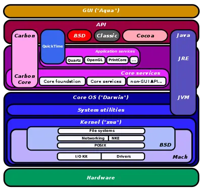 MacOS新的名称为Darwin, 这是Apple发布的类Unix的操作系统, 内核由XNU构成, 而XNU是基于NeXTSTEP和FreeBSD混合开发组成. 架构图如下: