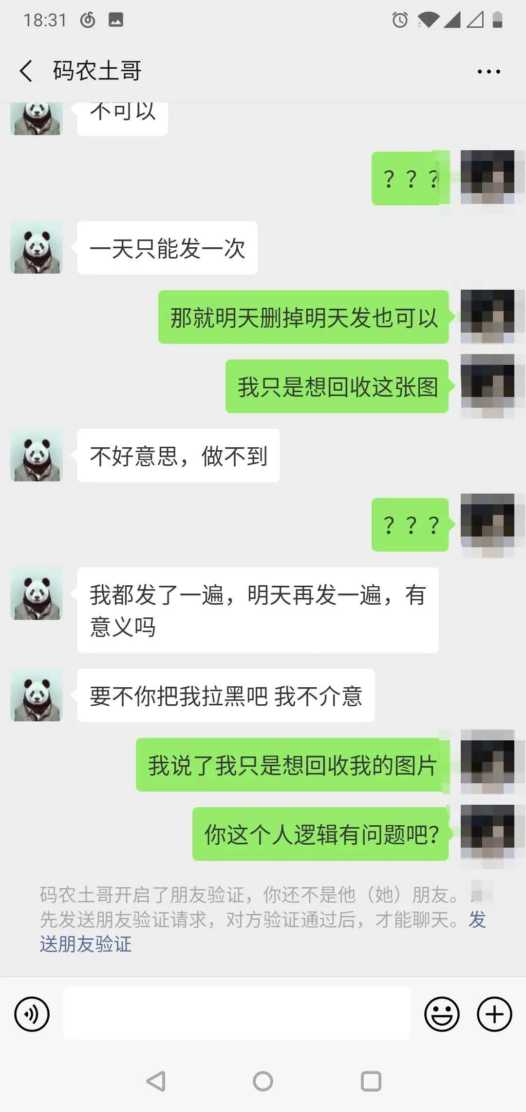 与此人沟通,期望能换下我的照片并诚恳道歉,也可以在道歉后获得我的授权继续使用。 但是此人道歉态度在我看来很敷衍,我不想接受他的道歉,也不想授权他使用照片,让他换下照片,他并不答应,并开始耍无赖并拉黑我,以下是聊天记录: