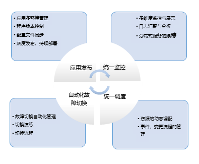 可以看到,需要解决的问题包含服务治理、分布式管控平台、应用的查询、运维的试点、硬件起动监控平台、运维操作的自动化、持续交互以及分布式统一平台;机房切换自动指挥平台、应用排除可视化;实时交易分析、实时链路分析、运维架构可视化;还有云服务系统,包括服务跟踪的智能化、日志分析一体化,还有服务跟踪等问题。