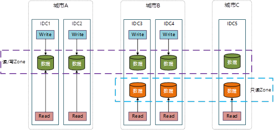 脑裂问题是分布式多活建设必须面临的问题之一,为了应对该问题主要从两个方面考虑:其一,设计高可靠的数据中心分布式多活架构,尽量规避脑裂问题的产生,采取的应对措施保行多数据中心之间采用不同运营商的线路进行连接,关键网络连接设备均采用容灾设计;其二,是在脑裂出现之后,能够实现快速的隔离,对上层业务无影响,因此建议采用三地五中心高可用部署(同城两数据中心可读/写,临近城市两数据中心可读/写,远端城市异步可读)。当出现脑裂问题时,通过在多个数据中心之间进行快速选举投票,剔除脑裂中的一个数据中心节点,实现城市级无损容灾、自动故障切换、对上层业务透明。具体设计方案图如下: