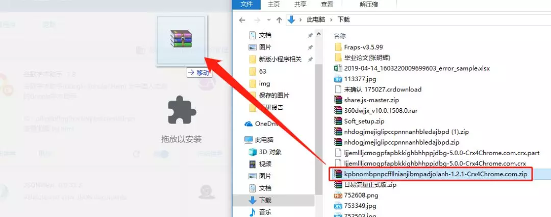 如下图,按住 xxxxxx.zip 拖动到chrome扩展中心