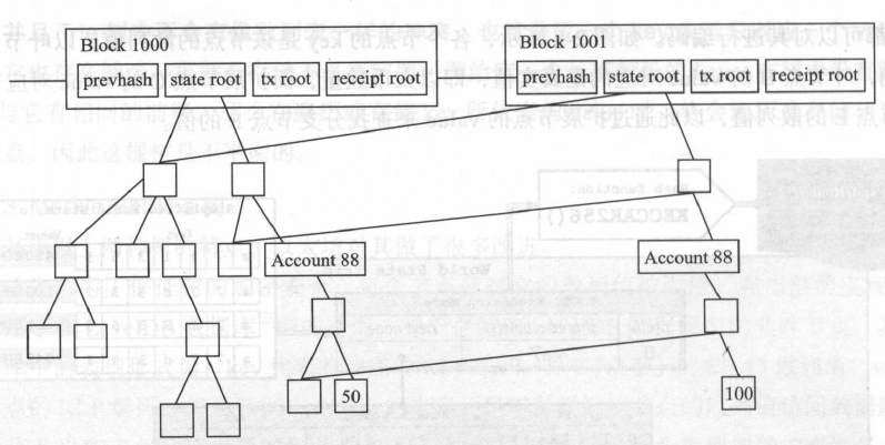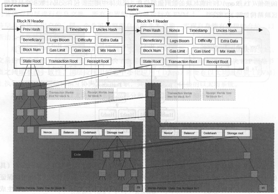 以太坊区块链上区块数据结构相对比特币的一个重大改变就是保存了三棵Merkle树根,分别是状态树、交易树和收据树。