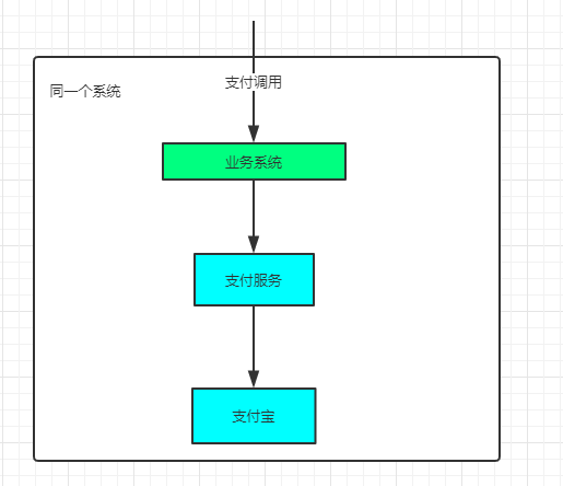 支付系统初期,这个阶段业务需求较简单,仅仅需要满足一个支付场景(例如使用支付宝支付)。为了快速上线,设计方案就简单粗暴,对外直接暴露支付服务接口,由业务系统发起直接调用。