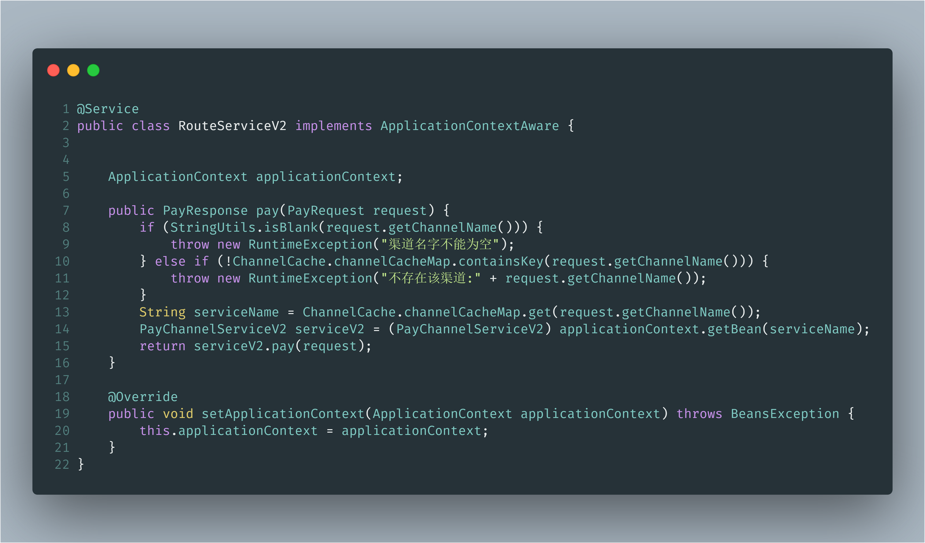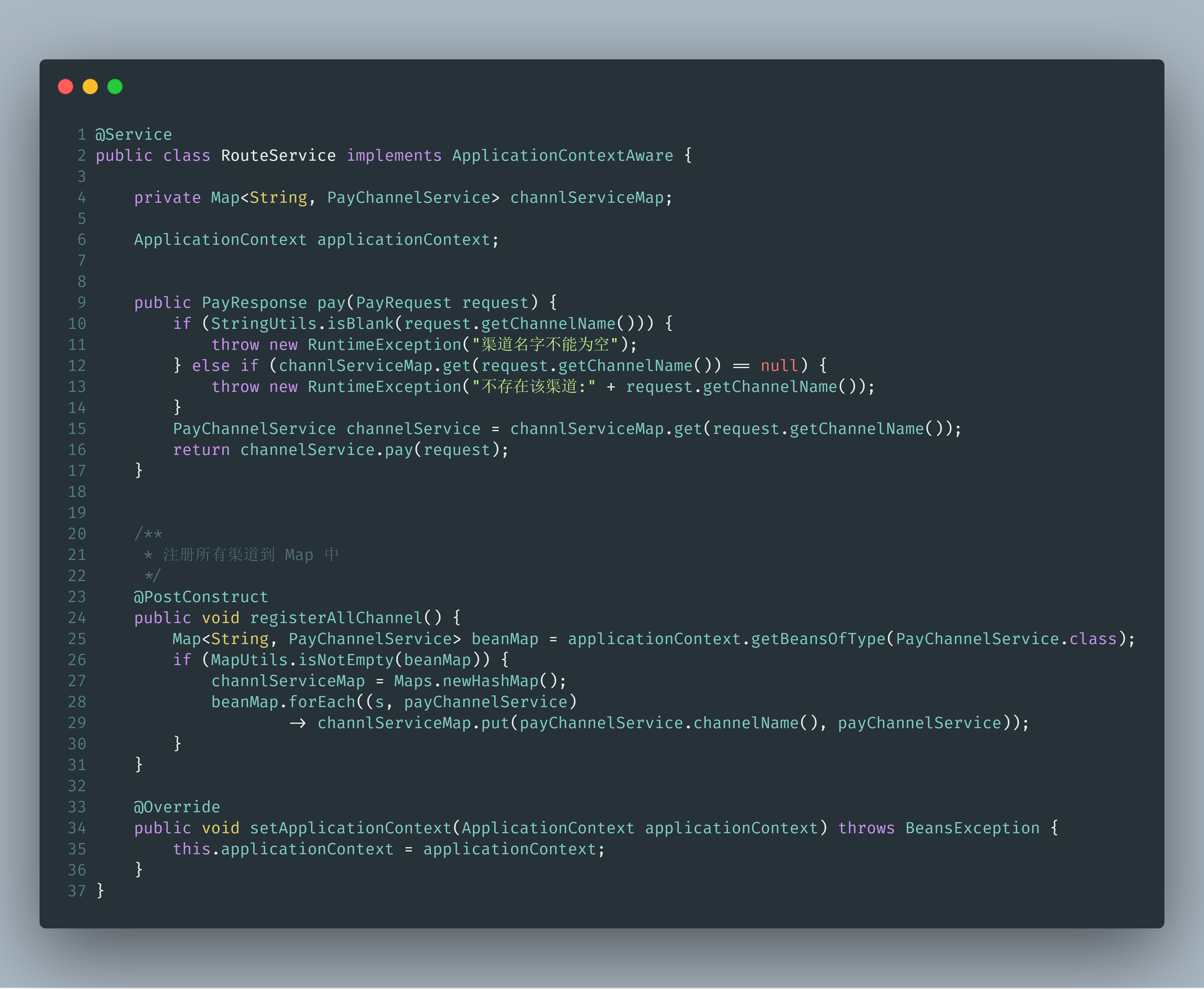 然后根据 Spring ApplicationContext getBeansOfType 方法,获取实现同一个接口的所有 Bean.最后将其放入 Map 缓存中,其中键值为 channelName 方法返回渠道标识。