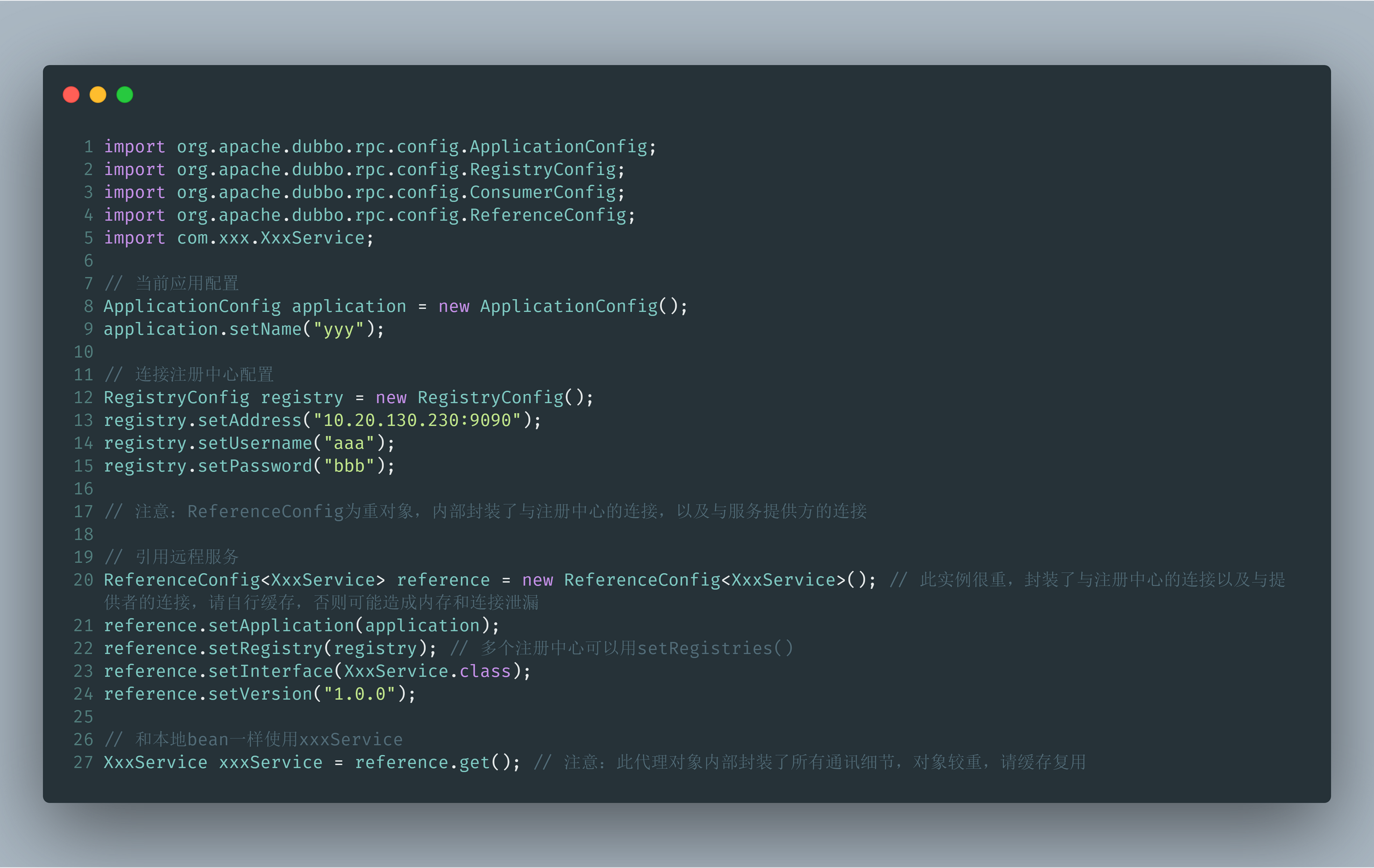 ReferenceConfig 实例很重,封装了与注册中心的连接以及与提供者的连接,需要缓存。否则重复生成 ReferenceConfig 可能造成性能问题并且会有内存和连接泄漏。在 API 方式编程时,容易忽略此问题。