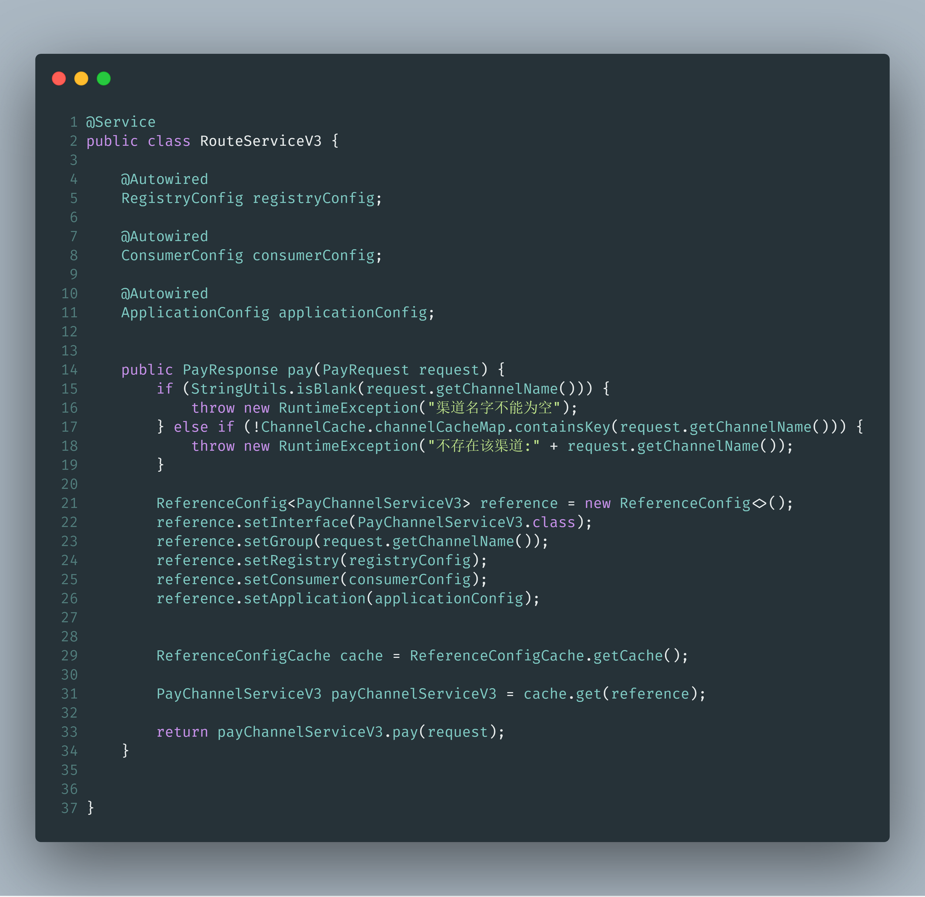这里同样需要设置 group 且需要和服务提供者一致。然后在路由系统中将服务注册到缓存中,使用渠道标识为 key,渠道服务名为 value。