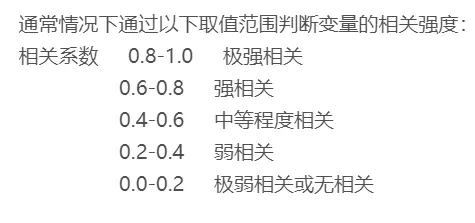 - 相关系数:考察两个变量之间的相关程度。相关系数的取值范围是-1到1,绝对值越接近1,则说明两个变量之间的相关程度越大;绝对值越接近0,则说明两个变量之间的相关程度越小,具体见下图: