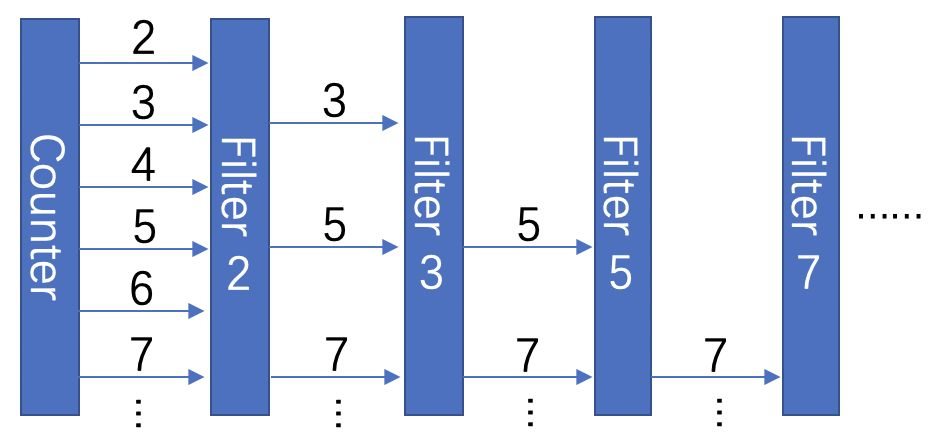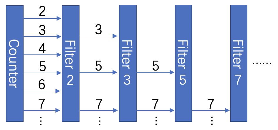 可以看到,我们的素数筛由三个部分组成,首先,Counter 从 2 开始依次产生自然数。PrimeFilter 就是每一层素数的过滤器,每一层过滤器只持有一个输入 channel 一个输出 channel 和一个素数 prime,它将不断从输入 channel 中读入数字,并将其中无法被 prime整除的部分输出。PrimeSieve 则是一个完整的素数筛,它每获得一个素数,都将素数输出,并创建一个新一层的过滤器,因此整个过程大概是这样的: