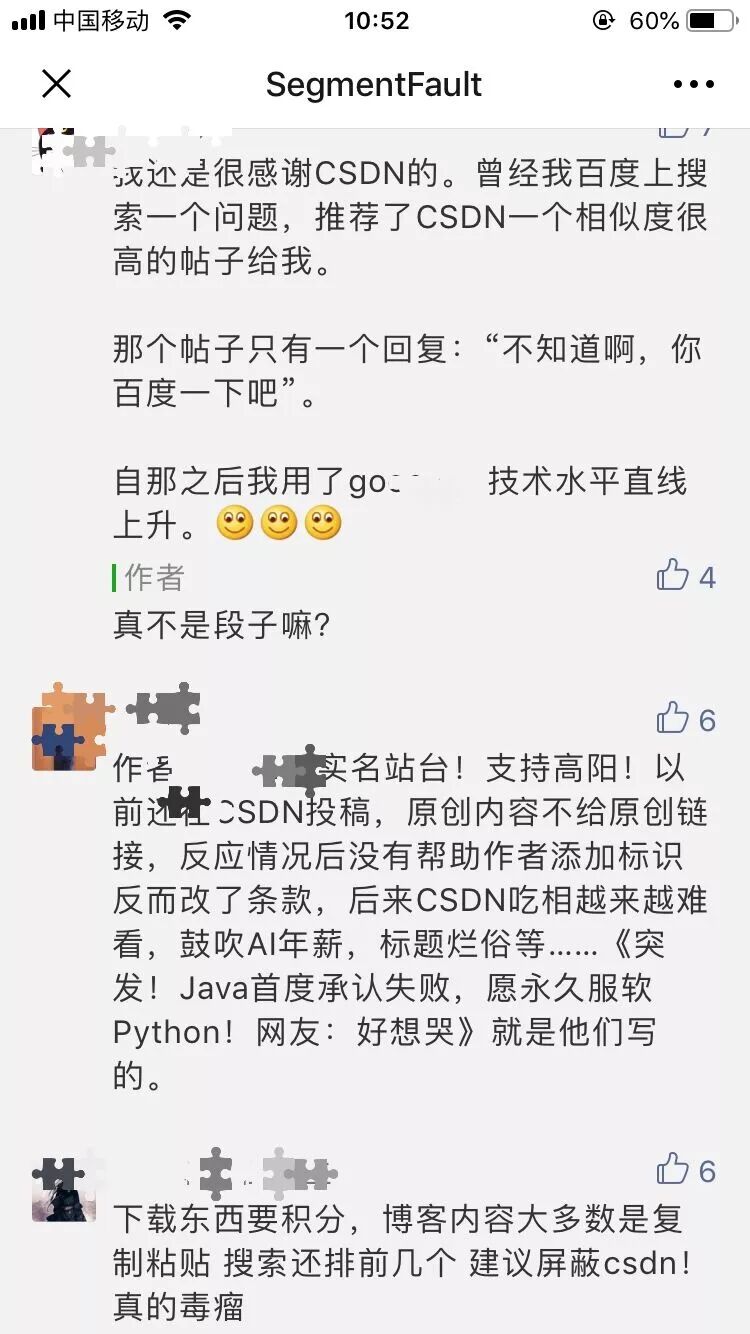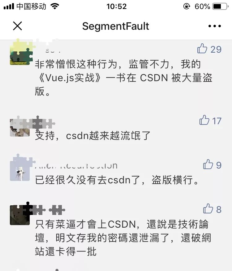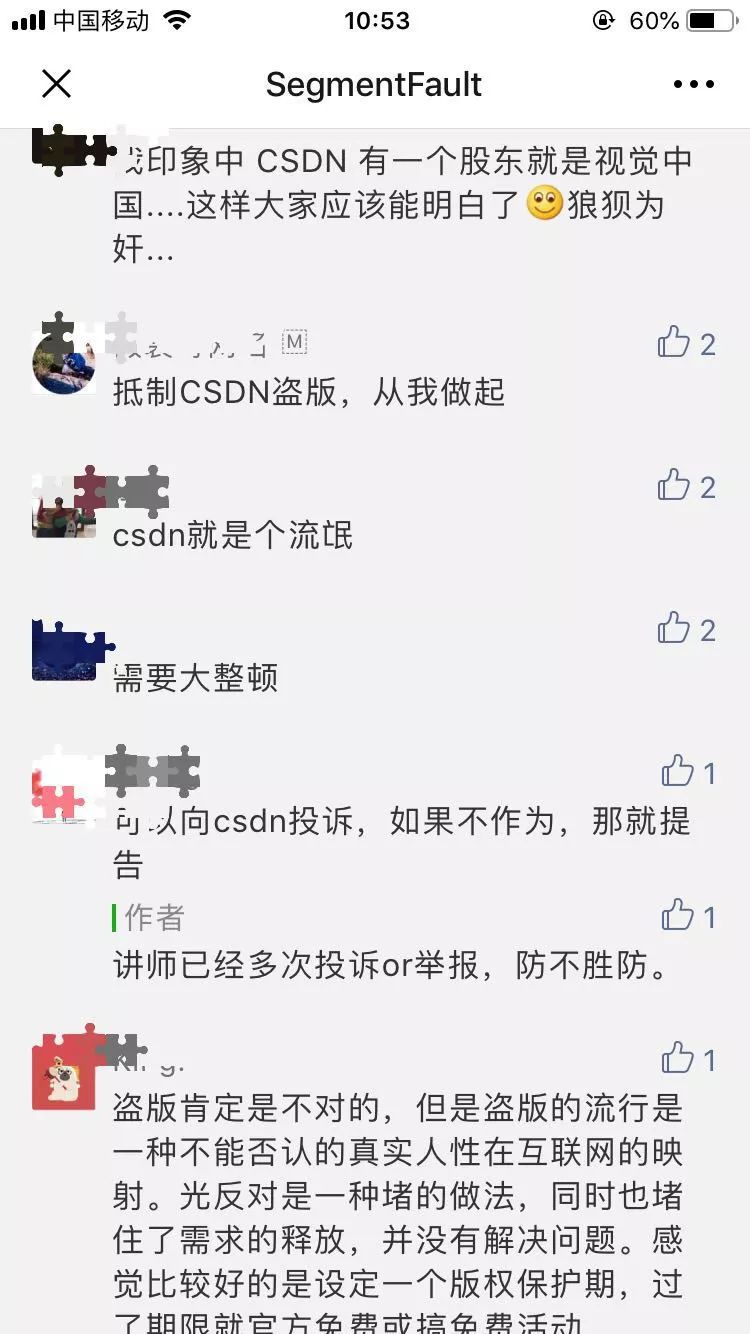 其实技术圈子非常小,很多同行可能碍于面子或者各种各样的原因,没有公开地去声讨 CSDN,一些声讨可能也并没有解决问题,这更助长了其纵容盗版的气焰。 SegmentFault 作为技术社区的一员,我们深知社区发展的不易,我们有责任帮助我们的讲师维护其付费内容的版权不被侵犯。