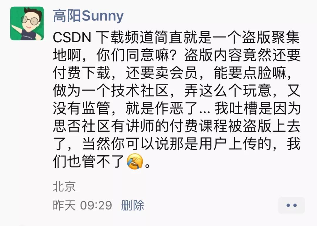 CSDN 做为中国最早的技术社区之一,我们认可其对开发者之间线上交流做出的贡献,但是其下载频道的存在大大助长了大量盗版侵权内容的产生。并非个例,长期存在,越发泛滥,从未被解决——这代表其产品存在根本上的机制问题。