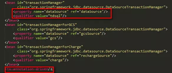 对于多个数据源,当然,我们需要定义多个事务管理器,同时也得开启事务注解。多个事务管理器,可以通过qualifier属性进行区分。