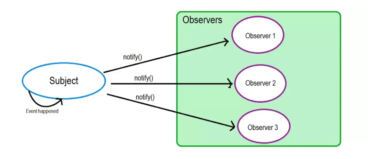 在没有详细研究设计模式之前,听别人说观察者模式就是发布订阅模式,直到自己去研究的时候发现它们确实有渊源,但是并不是一个东西。观察者模式它(Subject)会维护一个依赖列表,当内容更新时会主动通知依赖列表里面的所有Observe。但是发布订阅模式是订阅者会在订阅中心订阅它关心的主题,而发布者会在订阅中心发布相关的主题消息,因此它们之间是有一个中间人(调度中心)。有一篇文章对观察者模式和发布订阅模式讲的很不错,我也是看了这篇文章才有所了解观察者模式 vs 发布-订阅模式,一下是观察者模式的一个图解(也是从上面那篇博文偷过来的,发布订阅模式的图解也偷自该博文):