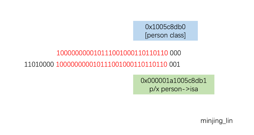 shiftcls中存储类对象地址。把转为2进制的实例对象isa地址与转为2进制的类对象地址作对比,可以看出存储类对象地址的33位二进制内容完全相同。