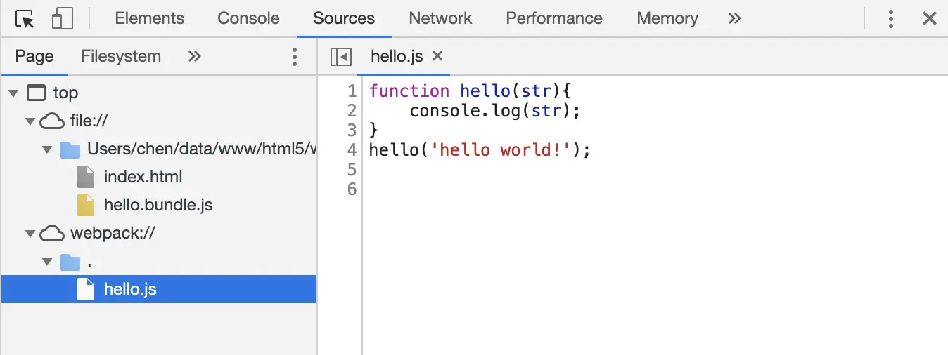 因为我们使用的是开发模式,展开webpack://选择hello.js