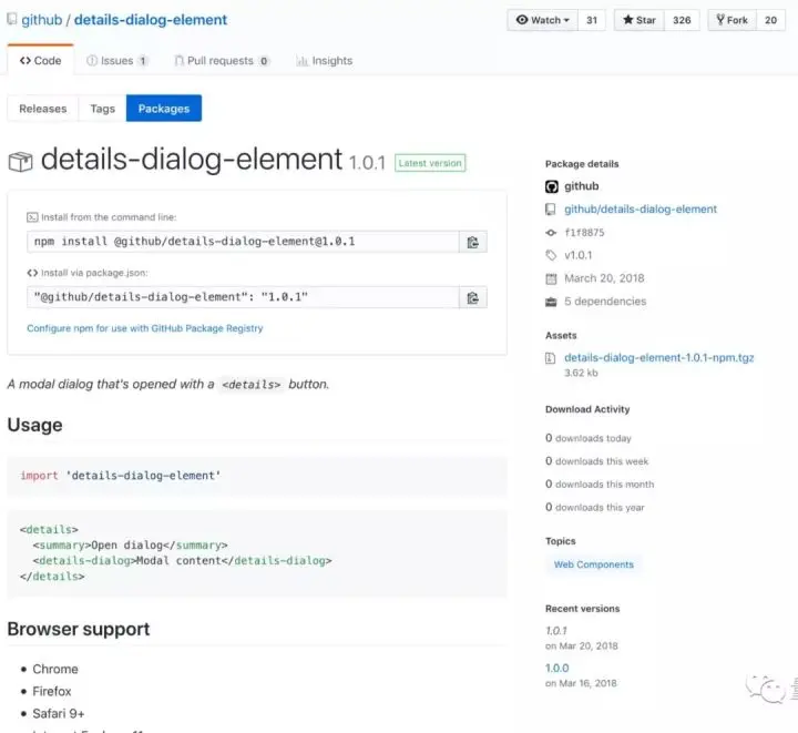 GitHub上托管的软件包,都有详细信息、下载统计,以及完整的历史记录可以查看。