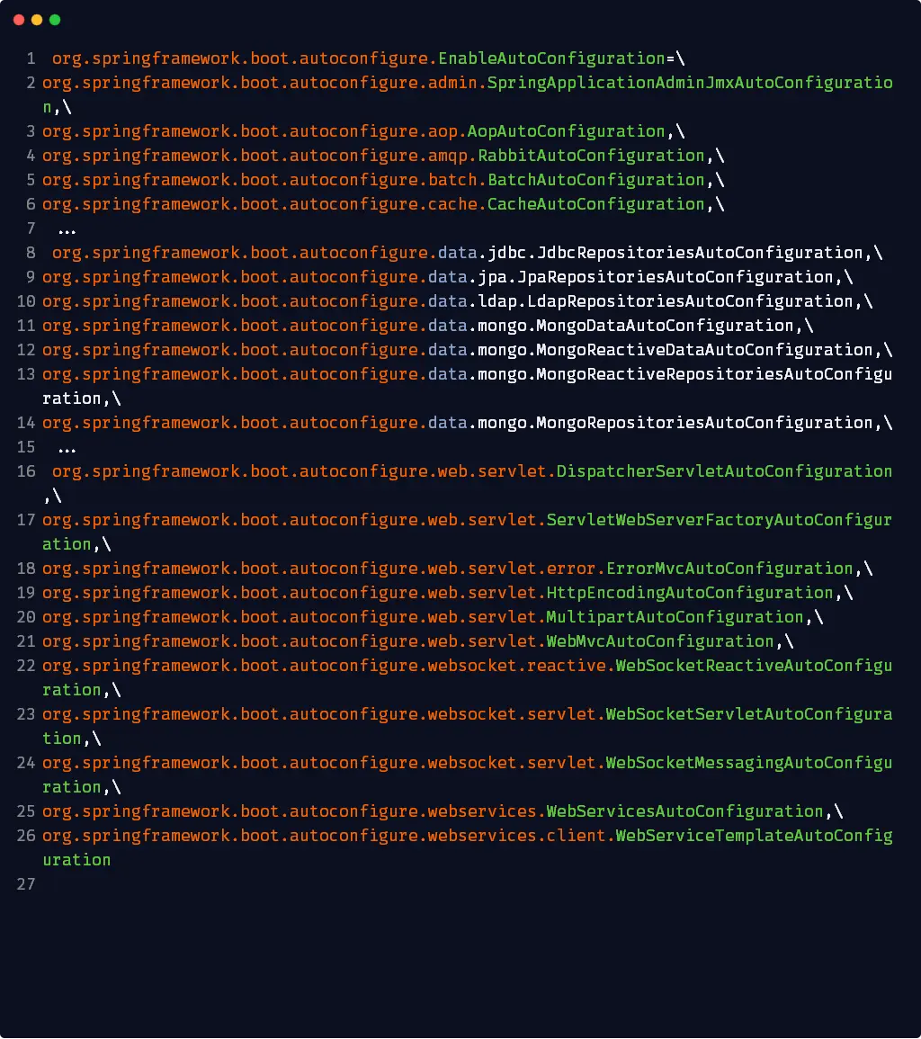 在spring-boot-autoconfigure.jar包中还有一份重要的文件,它是Spring Boot实施自动配置的关键所在。该文件是/META-INFO/spring.factories。此文件列出了所有可以被Spring Boot实施自动配置的模块清单,下面列举其中的一部分以供参考: