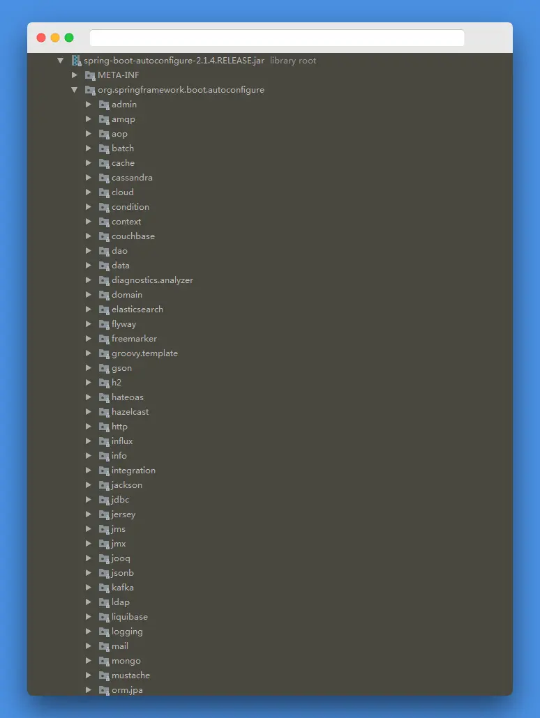 Spring Boot有关自动化配置的源码可以在spring-boot-autoconfigure-2.x.x.x.jar/spring-boot-autoconfigure-1.x.x.x.jar包中找到。在org.springframework.boot.autoconfigure包下,提供了如下的一些自动化配置源码: