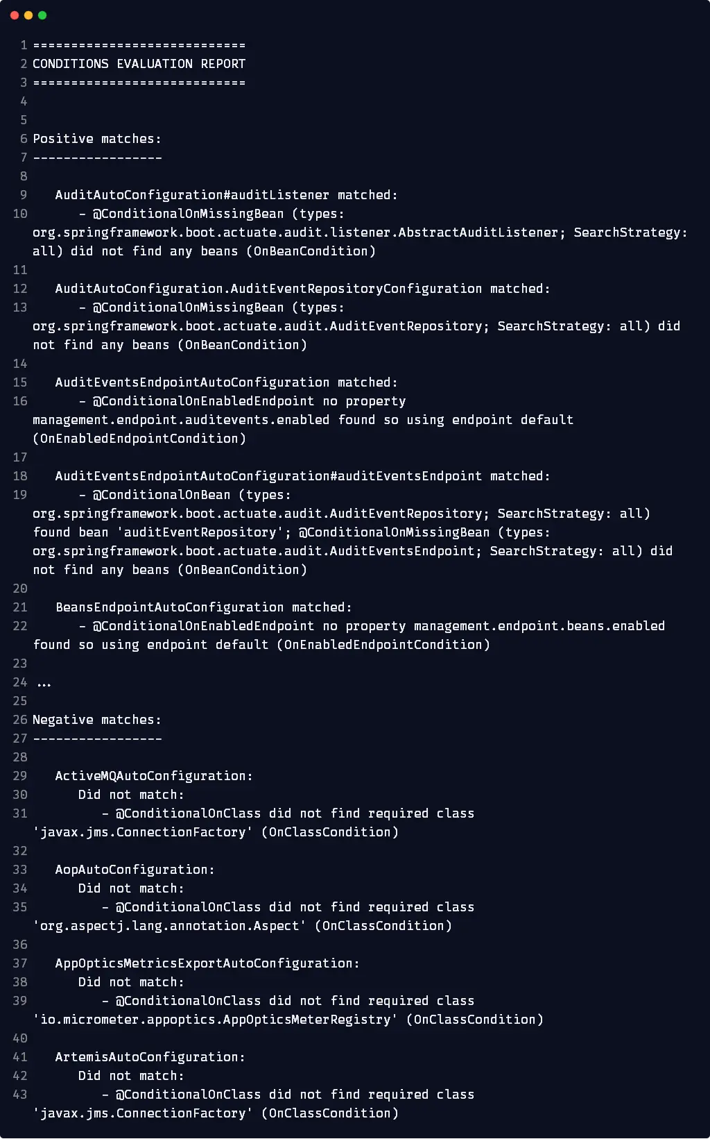 使用方式一和方式二时,当我们重新启动应用程序时,你可以在控制台找到一份自动配置的报告,这份报告包含了被自动配置的组件信息和未被自动配置的组件信息以及相关的说明。