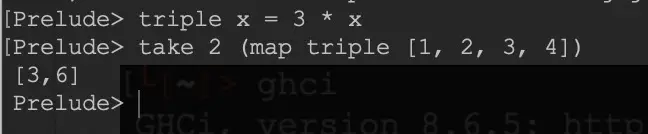 试玩后最直观的感觉是 Haskell 的函数和传统语言有很大差异,Haskell 的函数体是有值的表达式,不像其他语言充满业务逻辑,调用上也有不同。例如对一个数组的元素乘3然后取前2个,写法如下: