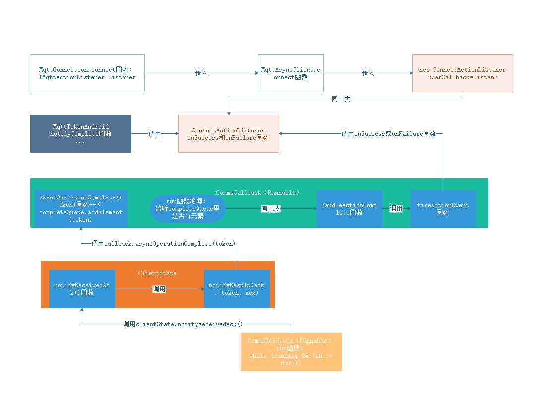 简单说明下listener调用过程:listener会被传入MqttAsyncClient类里,随后又通过初始化ConnectActionListener类并保存于其成员变量userCallback中,最后是在ConnectActionListener里的onSuccess和onFailure两回调方法中调用了listener的onSuccess和onFailure两个方法,而ConnectActionListener里的onSuccess和onFailure两函数一般是CommsCallback类所调用(也会被MqttTokenAndroid类的notifyComplete函数调用,notifyComplete函数被MqttAndroidClient类的simpleAction和disconnected两方法调用,而simpleAction函数又会被连接、订阅、解除订阅、发送等调用,暂时只简单说一下这种情况)。上面代码注释中也说过CommsCallback是接收器和外部API之间的桥接。此类由Receiver调用,然后将以comms为中心的MQTT消息对象转换为外部API可理解的。 CommsReceiver接收器里轮询会调用ClientState.notifyReceivedAck((MqttAck)message);函数,该函数里有几种消息会调用notifyResult(ack, token, mex);函数,notifyResult方法对调用(CommsCallback)callback.asyncOperationComplete(token);对CommsCallback里成员变量completeQueue(Vector)进行addElement操作,而CommsCallback的run方法又是一直轮询监听completeQueue里是否有元素,有则调用handleActionComplete方法--》fireActionEvent方法--》ConnectActionListener里的onSuccess和onFailure。 大致流程参考如图: