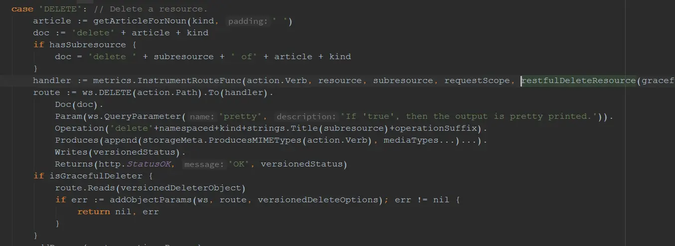 在之前分析kube-apiserver部分有分析到,kube-apiserver的http处理架构使用的是go-restful。其中,对于删除,调用的自然是DELETE接口。方法如下(位于kubernetes/staging/src/k8s.io/apiserver/pkg/endpoints/install.go下的registerResourceHandlers方法)