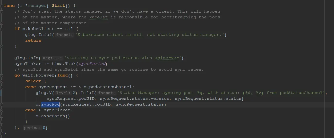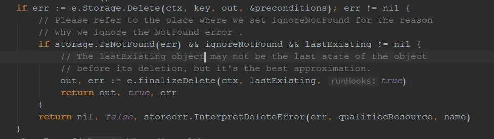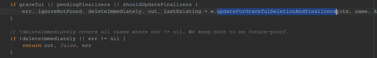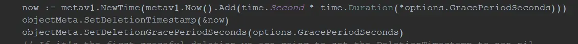 我们知道,Pod的删除如果不去强制删除,则其实是一个优雅的删除,也就是一个graceful的删除。默认情况下,这个优雅的时间是30s,也就是grace-period的时间。在kube-apiserver的任务中,通过updateForGracefulDeletionAndFinalizers方法为Pod设置了DeletionTimestamp和DeletionGracePeriodSeconds两个字段,此时Pod定义为graceful的状态。回到代码处,调用完updateForGracefulDeletionAndFinalizers方法后,下面有一个判断的语句