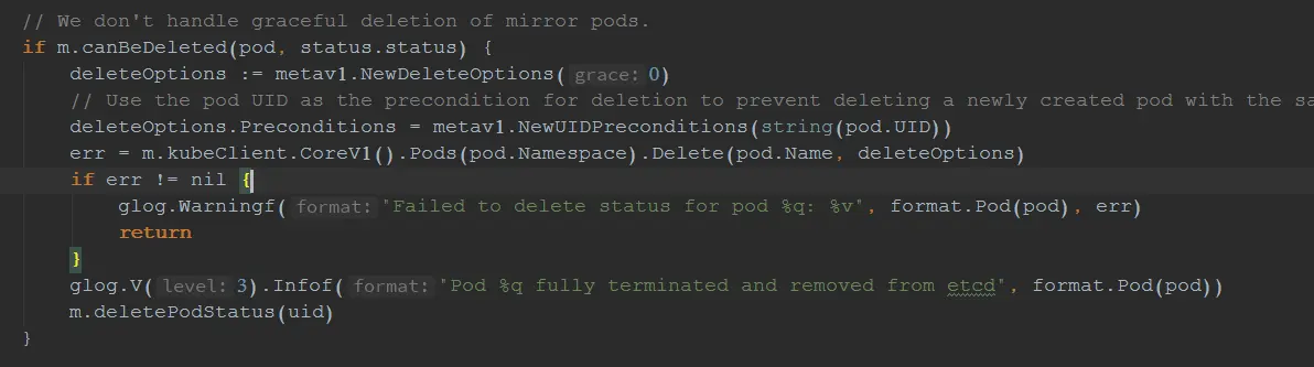 Kubelet在调用apiserver的删除接口的时候,提前会有一个判断,调用链为