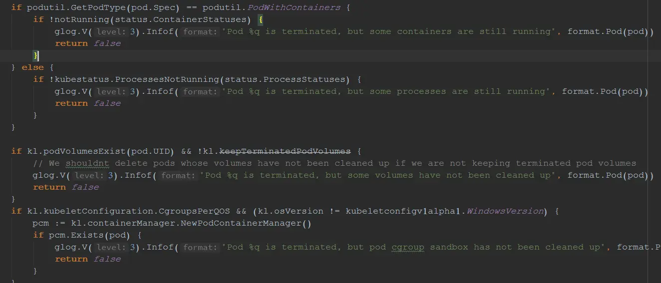 canBeDeleted-->PodResourcesAreReclaimed。在PodResourcesAreReclaimed方法内,主要的任务就是判断Pod内的资源是否已经完全关闭和清理,包括containers、processes、volumes以及cgroup sandbox资源。