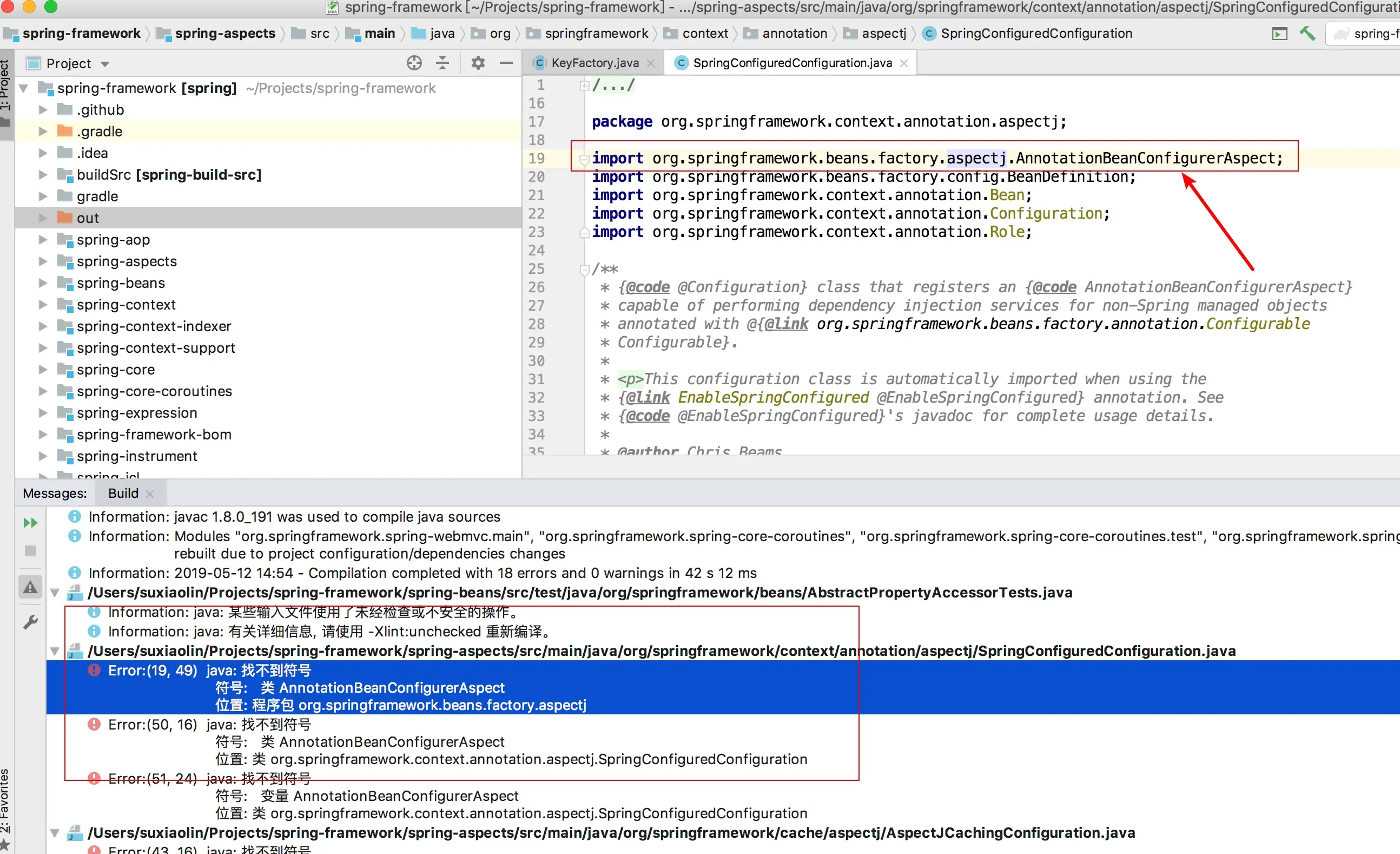 可以看到项目继续提示缺少org.springframework.beans.factory.aspectj包